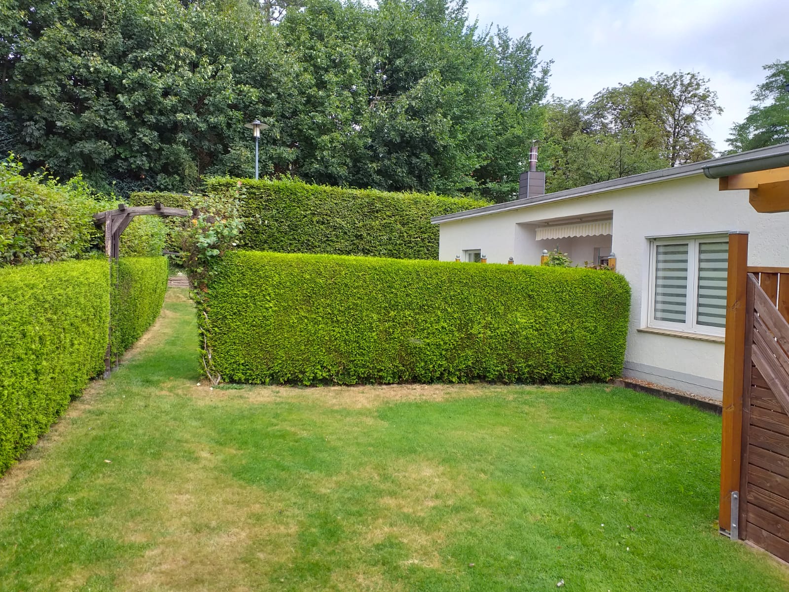 Durch das Wohnzimmer kommen Sie auf ihre überdachte Terrasse mit Garten und Liegewiese.